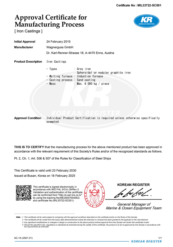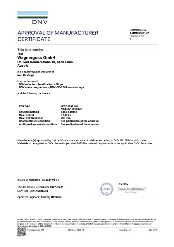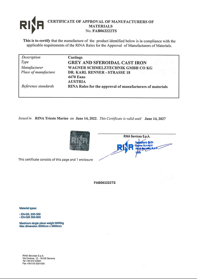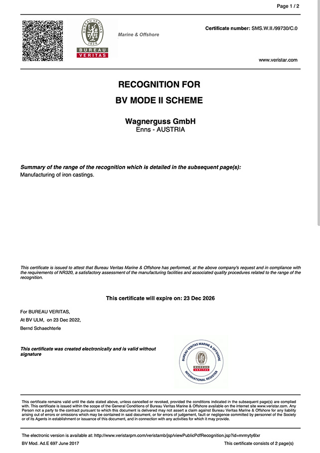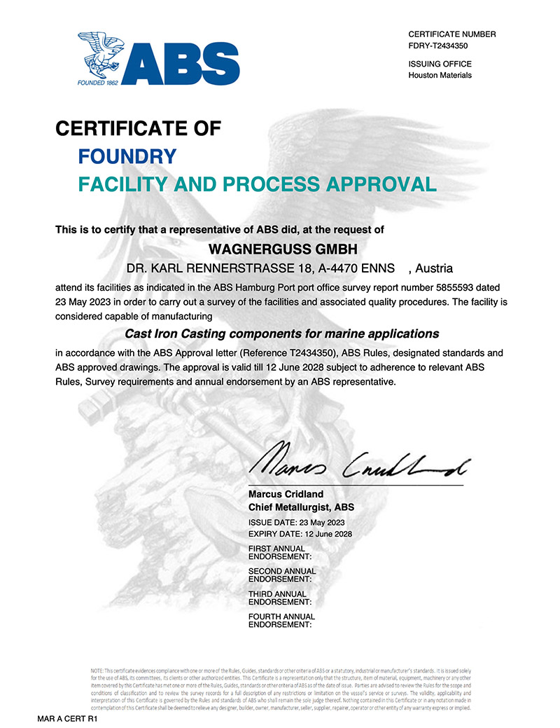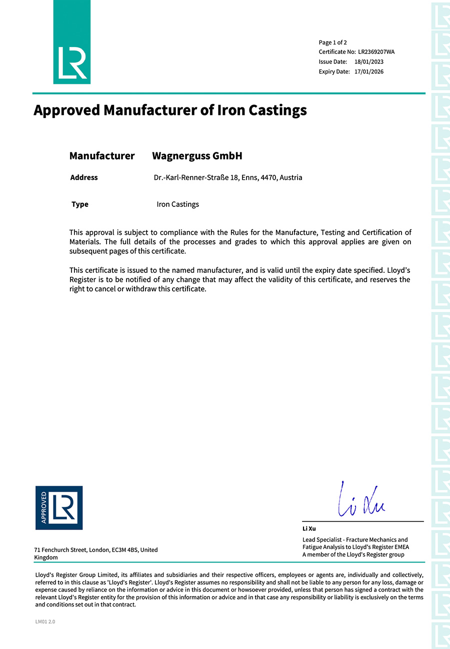 Die Sicherung unserer Qualität erfolgt durch ein TÜV-zertifiziertes Qualitätsmanagementsystem nach ISO 9001:2015. EN-GJL und EN-GJS von ABS, BV, CCS, DNV-GL, KR, NKK,LR und RINA zugelassen. Unseren Kunden bieten wir auch gerne Audits vor Ort an.